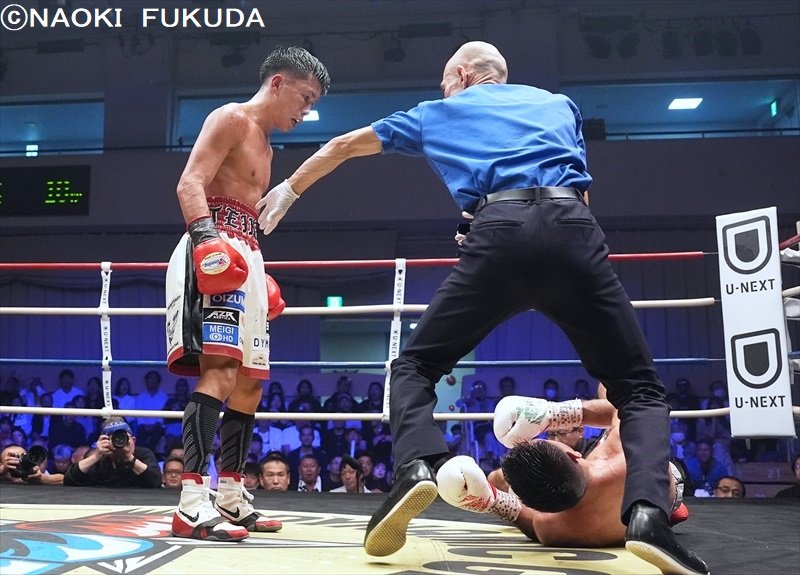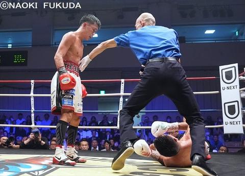 第2試合、日本ユース・ライトフライ級王座決定戦は日本9位の大木彪楽(横浜光)が日本11位、寺下列(エスペランサ)に7ラウンド2分52秒TKO勝利です。大木選手は4勝2KO1分、寺下選手は8勝1KO2敗としています。