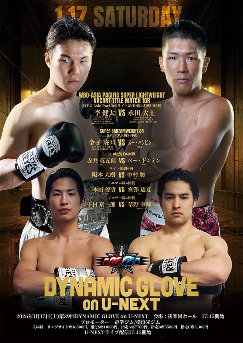 WBOアジアパシフィック・スーパーライト級王座決定戦/WBOアジアパシフィック同級1位、李健太(11戦10勝2KO1分) 対 同級5位、元同級王者、永田大士(三迫/27戦21勝7KO4敗2分)